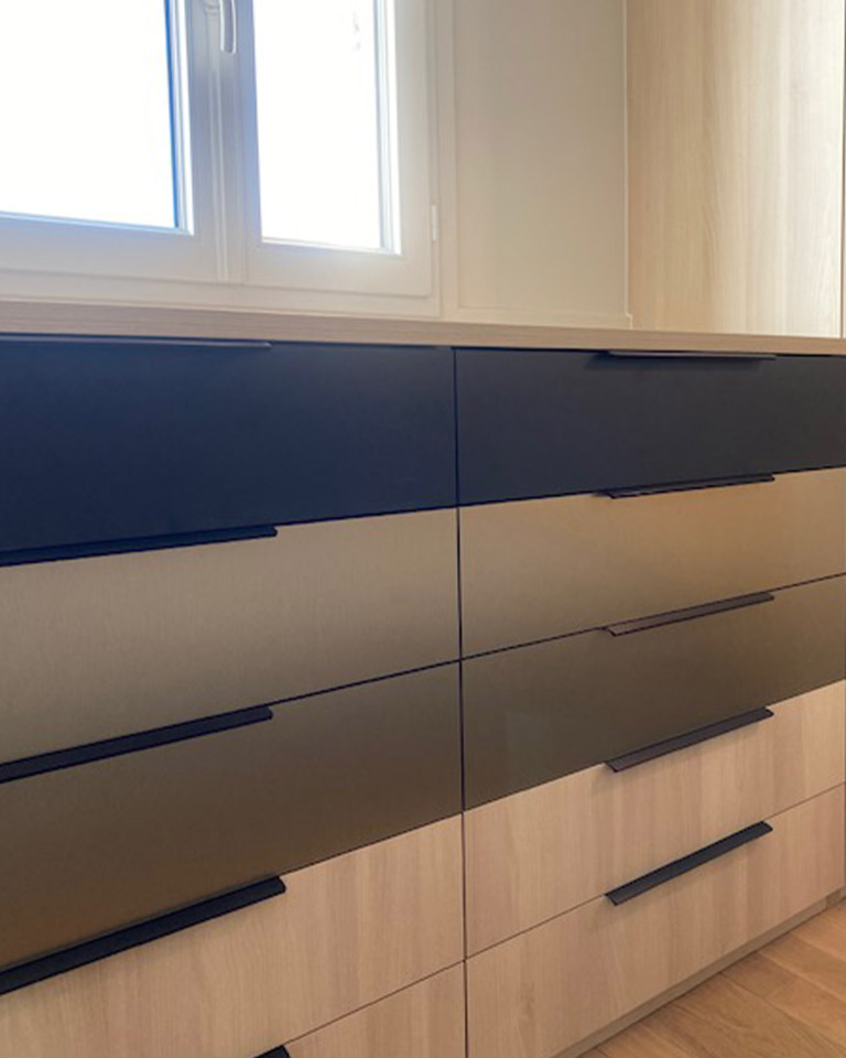 Notre réalisation : Avec son mélange de finitions (mélaminé bois acacia, noir mat et métal bronze brossé), cet aménagement apporte une touche moderne et originale à la pièce tout en offrant du rangement fonctionnel à l’intérieur.